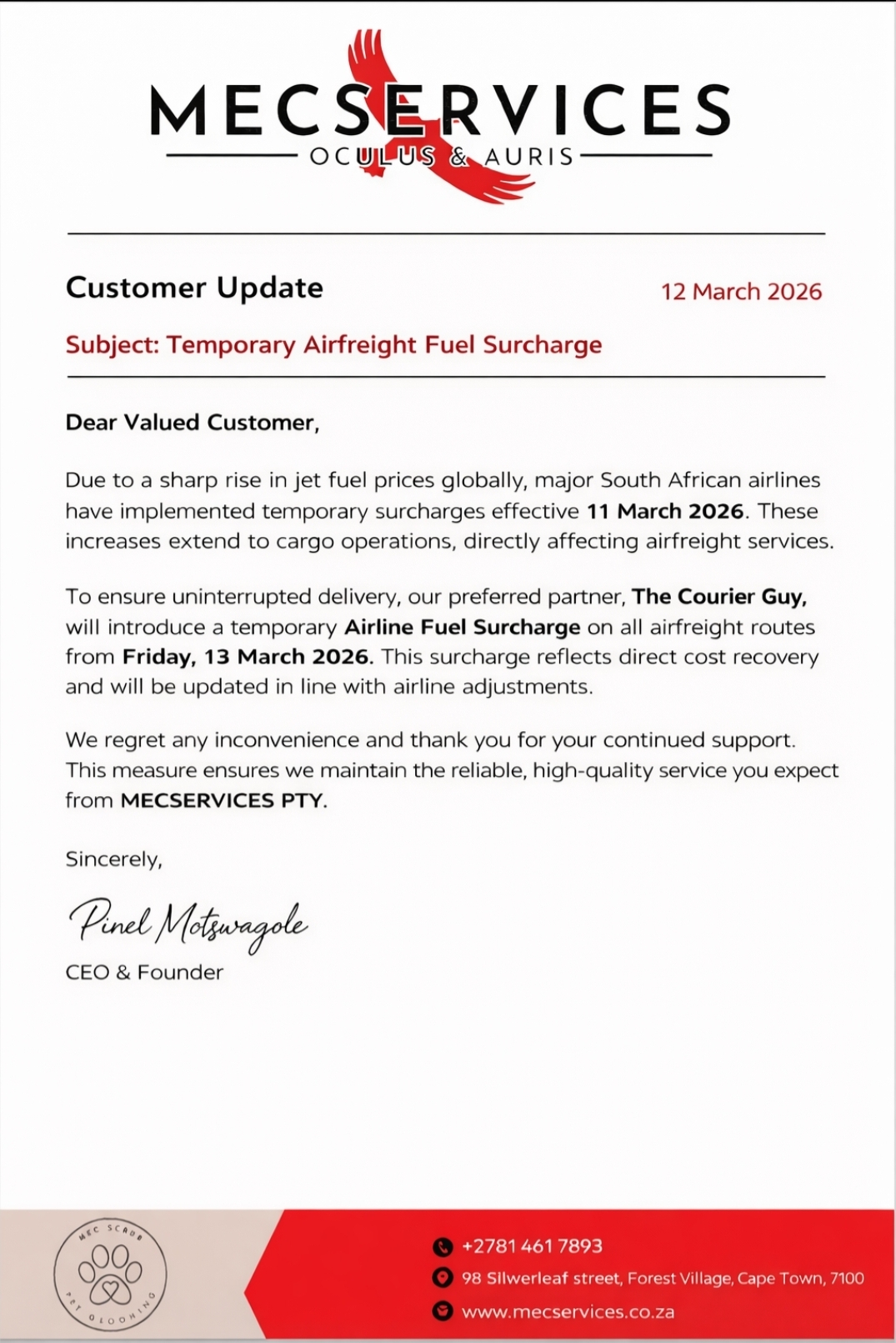 To ensure uninterrupted delivery, our preferred partner, The Courier Guy, will introduce a temporary Airline Fuel Surcharge on all airfreight routes from Friday, 13 March 2026. This surcharge reflects direct cost recovery and will be updated in line with airline adjustments.